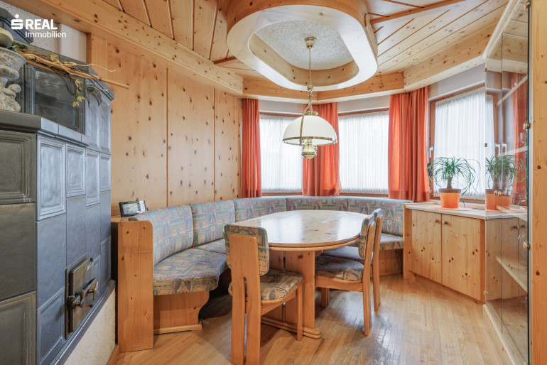 - Wohn-Esszimmer mit wunderschönem Kachelofen, der eine besondere Gemütlichkeit zaubert