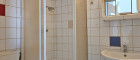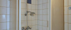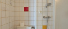 - Badezimmer mit Dusche, Toilette, Handwaschbecken und Waschmaschinenanschluss