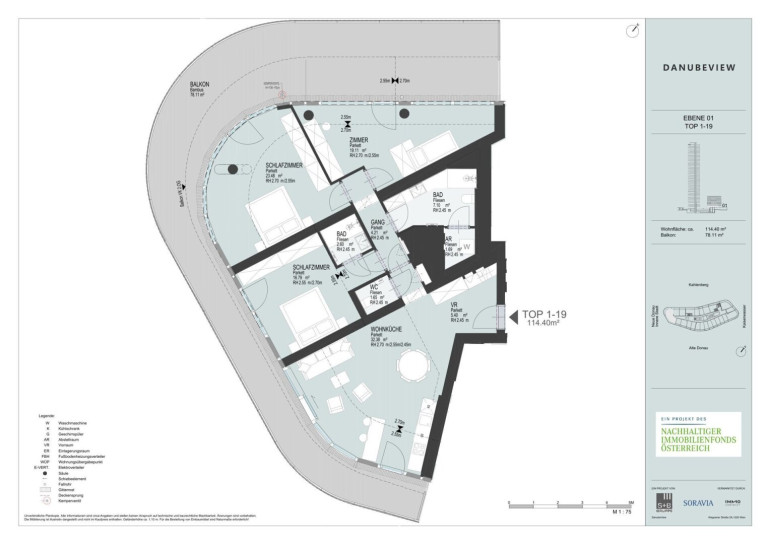 DANUBEVIEW umfasst insgesamt 159 Mietwohnungen mit Größen zwischen 30 m² und 150 m², verteilt auf 1 bis 4 Zimmer. Großzügige Grundrisse und lichtdurchflutete Räume mit weitläufigen Fensterfronten eröffnen atemberaubende Ausblicke auf die Donau und die City.