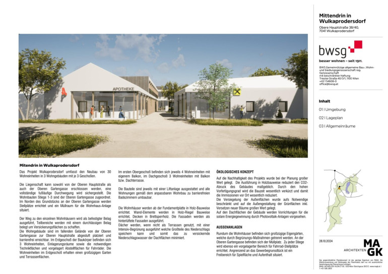 Zwischen der Oberen Hauptstraße 38–40 und der Oberen Gartengasse entstehen vier Gebäude mit insgesamt 30 Wohnungen und einem Gewerbezentrum mit Fokus auf das Gesundheitswesen. Neben einer Apotheke sind mehrere Ordinationen und eine Bank geplant.