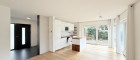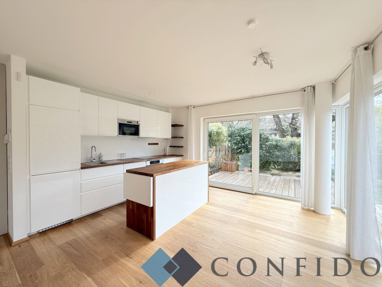 Bereits beim Betreten überzeugt die gelungene Raumaufteilung. Auf der ersten Wohnebene befindet sich der rund 36 m² große Wohnbereich mit ausgestatteter Küche. Große Glasfronten sorgen für ein helles, freundliches Ambiente und eröffnen den Blick in den liebevoll angelegten, süd- östlichen Garten mit Terrasse. Das umliegende Grün schafft ein hohes Maß an Privatsphäre und Wohnqualität. Der bereits installierte Schwedenofen sorgt zusätzlich für eine besonders heimelige Atmosphäre. Ein ca. 2 m² großer Abstellraum mit bereits installierten Regalen, eine Gästetoilette sowie der Vorraum komplettieren diese Ebene.