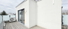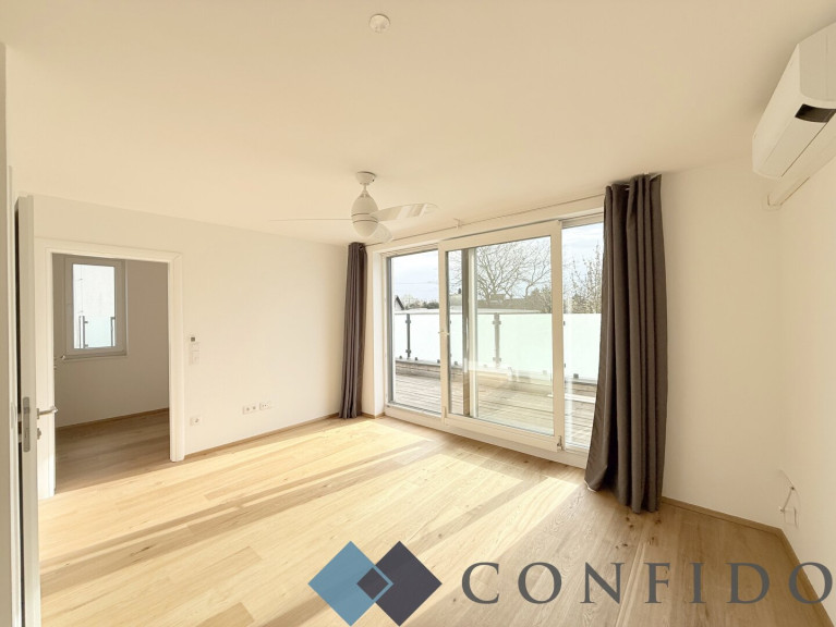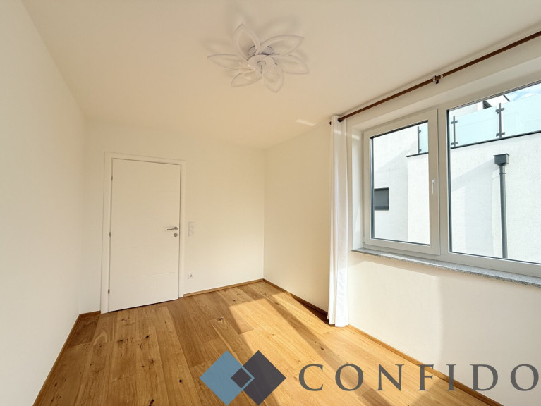 Im obersten Stockwerk befindet sich das Master Bedroom mit rund 20 m². Der vordere Bereich bietet Platz für einen möglichen Schrankraum. Ebenso verfügt diese Ebene über ein weiteres En-Suite-Bad mit bodengleicher Dusche und Toilette. Von hier aus gelangen Sie direkt auf die rund 18 m² große, östlich ausgerichtete Terrasse, die mit einem herrlichen Weit- und Grünblick begeistert.