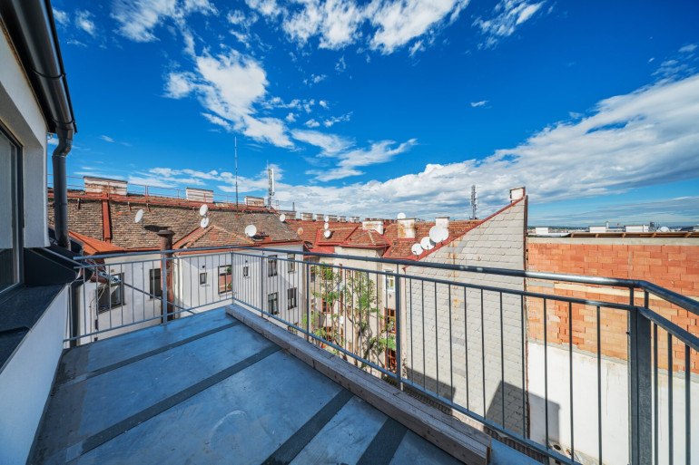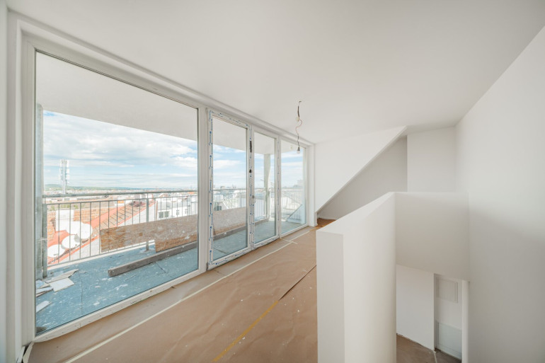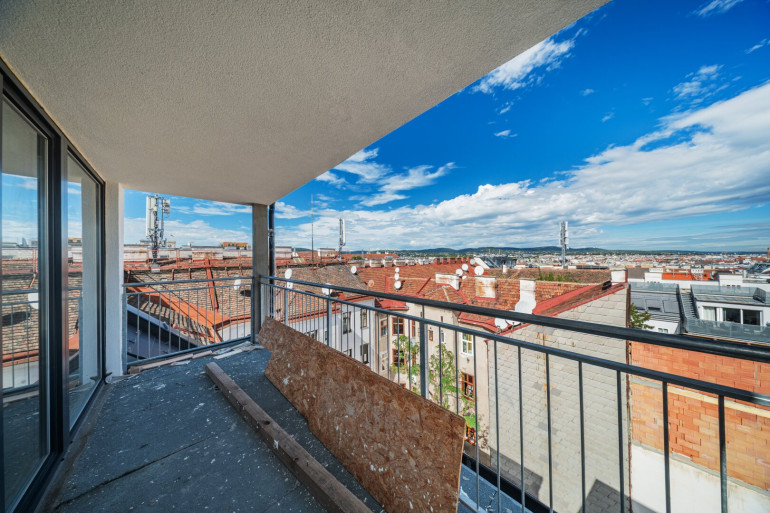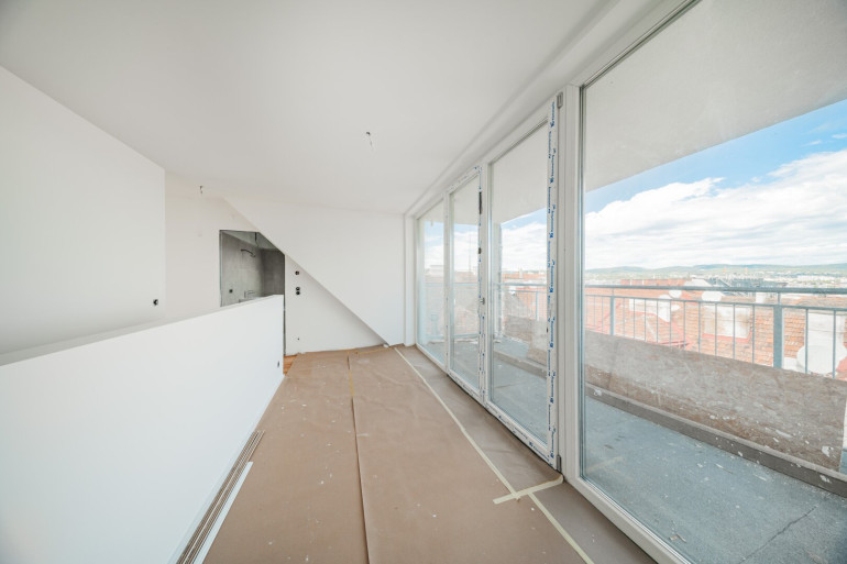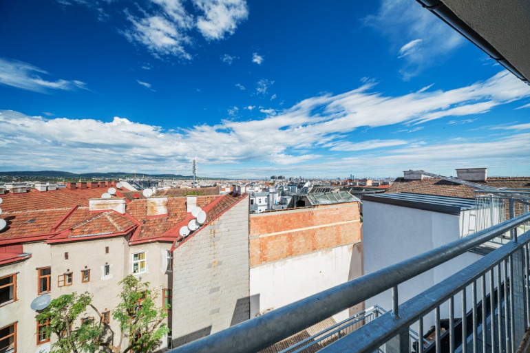 Von der Galerie gelangt man auf die ca. 12 m² große Terrasse, die durch ihren freien, unverbauten Blick über die Dächer Wiens beeindruckt.