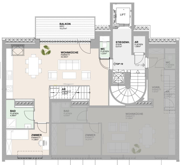Fliesen, Parkett, Fußbodenheizung, Wohnküche / offene Küche, Personenaufzug, Bad mit Fenster, Badewanne, Dusche