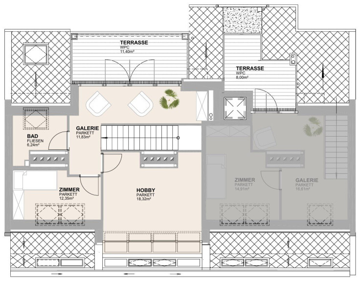 Großzügige Galerie, die als Leseecke, Home-Office oder Lounge-Bereich ein architektonisches Highlight darstellt.