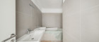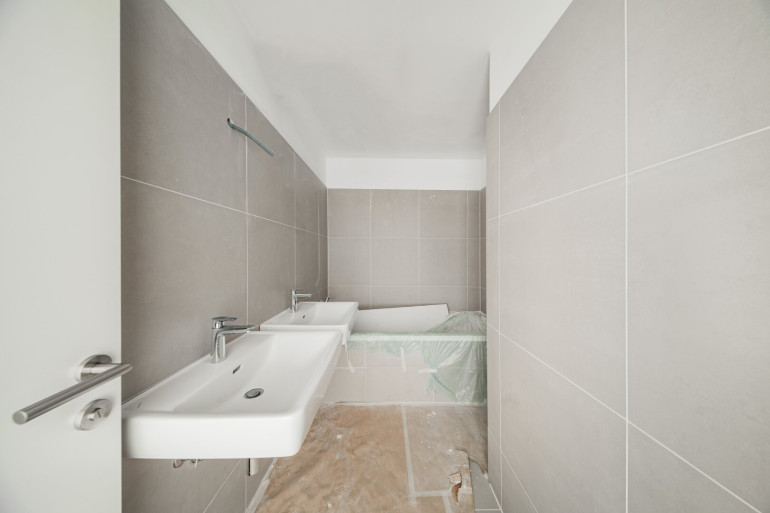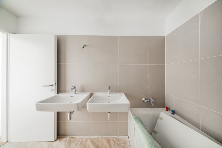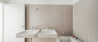 Badezimmer mit Doppelhandwaschbecken und Badewanne