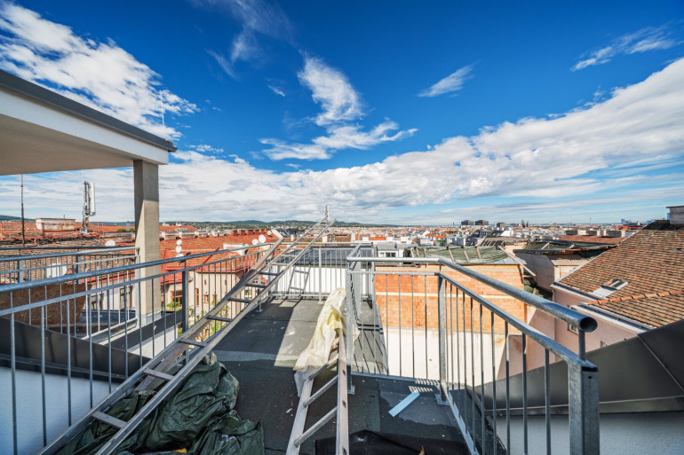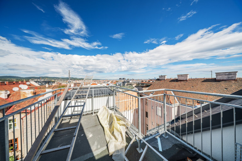 Von der Galerie aus gelangen Sie direkt auf die ca. 8 m² große Terrasse, die mit einem wunderschönen, freien Ausblick über Wien beeindruckt.