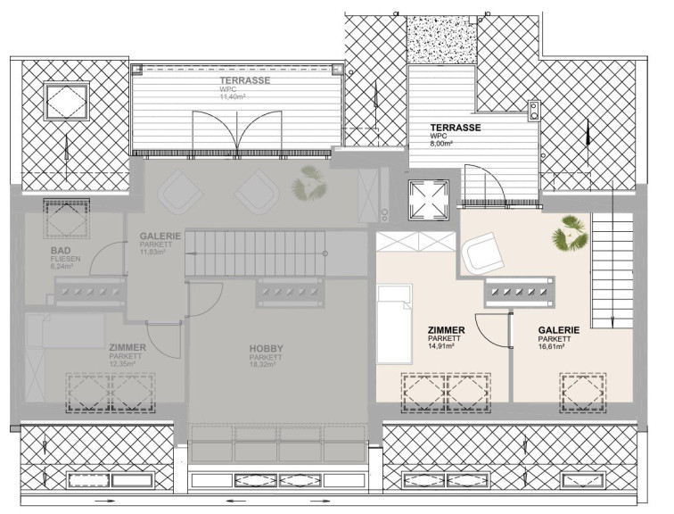Offene Galerie, die vielfältig gestaltet werden kann – ob als Home-Office, Lesebereich oder komfortable Lounge