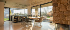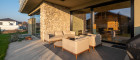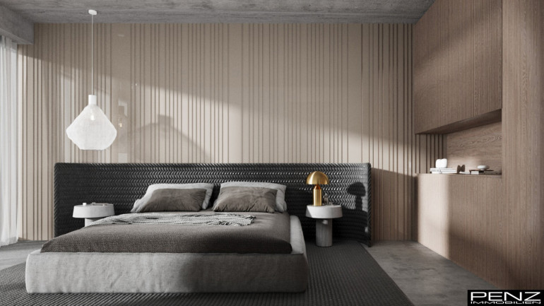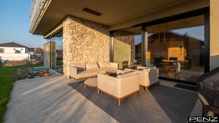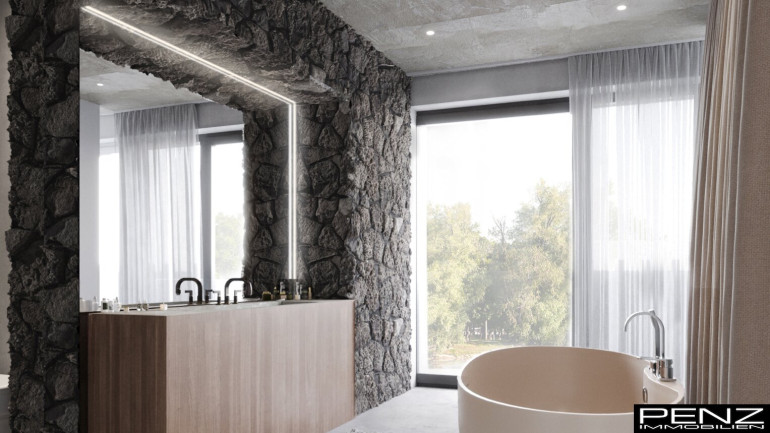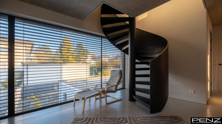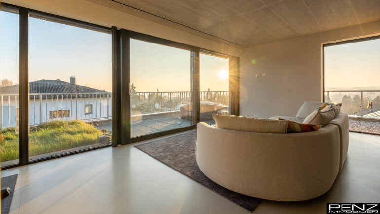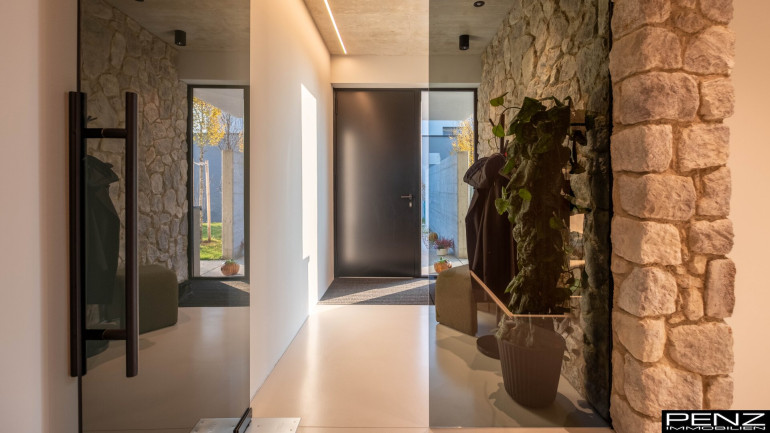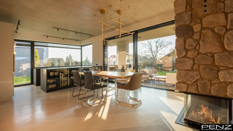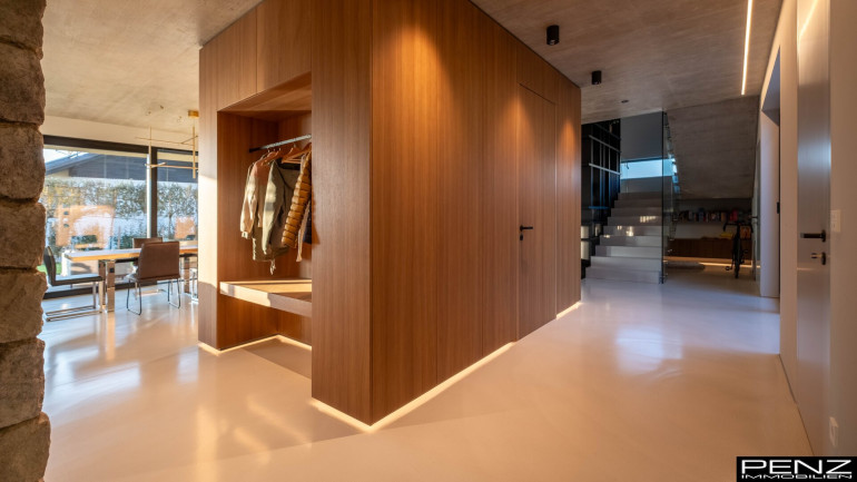 Im Inneren erwartet Sie ein Wohnraumkonzept, das Design, Komfort und Funktionalität perfekt vereint. Großzügige Raumhöhen und sonnendurchflutete Bereiche schaffen ein offenes, leichtes Ambiente. Edle Materialien wie ein Pandomo-Fußboden, ausgewählte Dielenböden sowie flächenbündige Türen setzen stilvolle Akzente und unterstreichen den exklusiven Charakter des Hauses. Sichtbetondecken verleihen dem Innenraum eine moderne, urbane Note, während eine Natursteinwand mit integriertem Kamin für Wärme und wohnliche Eleganz sorgt.