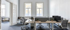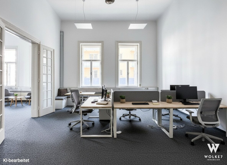 Über den Vorraum und den zentralen Gang erreichen Sie fünf helle, großzügige Arbeitsräume, die sich ideal in zwei Bereiche unterteilen lassen: drei miteinander verbundene Zimmer sowie zwei weitere zusammenhängende Räume. Der Vorraum kann etwa als Empfangsmöglichkeit oder Warteraum genutzt werden Die fünf Hauptbüros eignen sich ideal als Einzel- oder Teambüros. Alternativ können sie auch als Besprechungsräume dienen. Ein zusätzlicher, etwas kleinerer Raum bietet sich perfekt als Serverraum, Archiv, oder separater Arbeitsbereich, etwa zum ungestörten Telefonieren, an. Darüber hinaus verfügt diese Bürofläche über ein Bad mit Dusche, eine separate moderne Einbauküche mit angrenzendem Innenhofbalkon sowie 2 getrennte WCs.