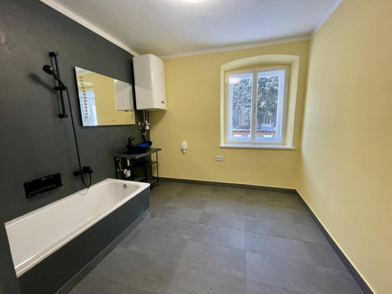 Großzügiges Badezimmer mit Badewanne und Fenster