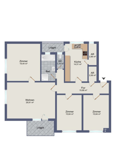 Die Räume sind großzügig geschnitten und gut strukturiert. Das Wohnzimmer bildet den zentralen Lebensmittelpunkt, während die weiteren Zimmer flexibel als Schlaf-, Kinder- oder Arbeitszimmer genutzt werden können. Zwei Loggien erweitern den Wohnraum nach außen und sorgen für zusätzlichen Freiraum.