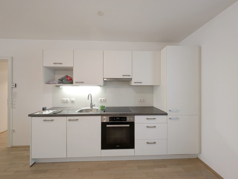 einladendes Vorzimmer, Wohnzimmer mit offener, moderner Einbauküche und Zugang zur südseitig ausgerichteten Loggia, zwei Schlafzimmer, Badezimmer mit Wanne und Waschmaschinenanschluss, ein praktischer Abstellraum sowie ein extra WC.