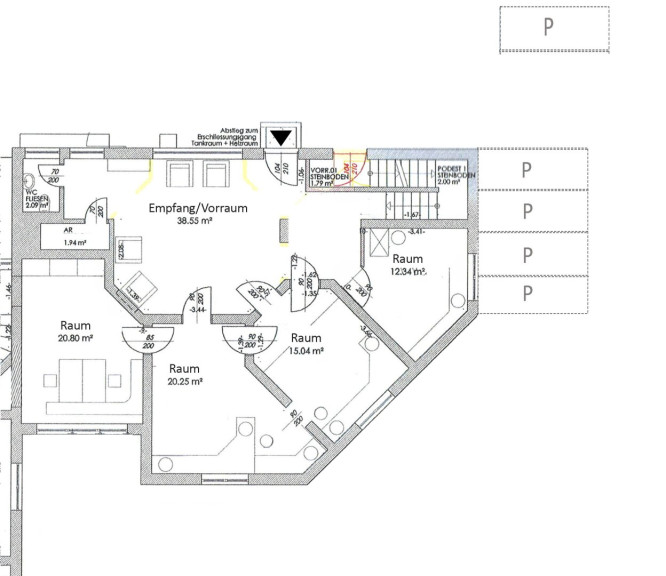 Im Erdgeschoss des bereits von weitem sichtbaren Gebäudes befindet sich die angebotene Büro- bzw. Ordinationseinheit mit fünf vorgelagerten dieser zugeordneten Parkplätzen.