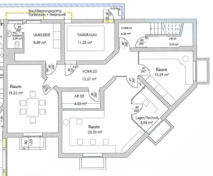 Die Räumlichkeiten im Ausmaß von ca. 210 m² erstrecken sich über zwei (intern verbundene) Ebenen – Hochparterre und Tiefparterre - sie sind nach drei Seiten (NO, SO u. SW) orientiert.