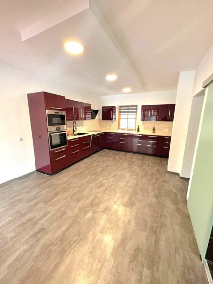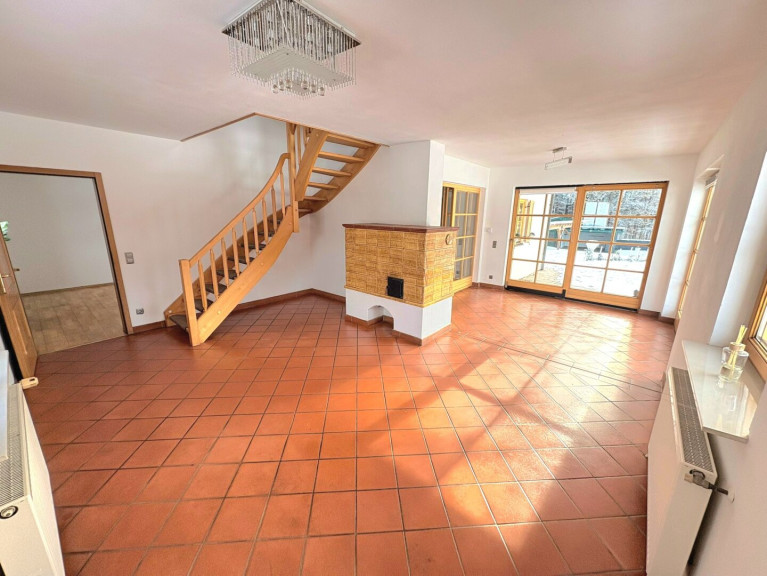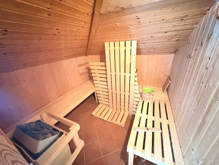 Parkett, Fliesen, Öl, Fußbodenheizung, Kamin, Zentralheizung, Einbauküche, Wohnküche / offene Küche, Bad mit Fenster, Badewanne, Carport, Garage, Sauna