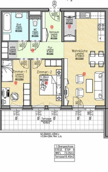 Die Wohnung verfügt über ca. 73 m² Nutzfläche und einen Balkon. Die Wohnräume sind mit Laminatboden, die Nassräume mit Fliesen ausgestattet. 3-fach-verglaste Fenster sorgen für angenehmes Raumklima.