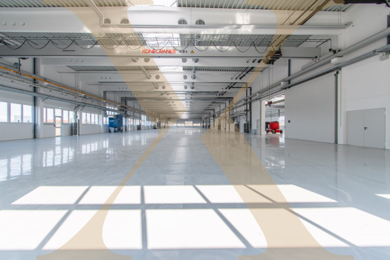 Auch dieser Hallenteil verfügt über eine Binderunterkante von ca. 6,95m sowie über einen 5-Tonnen-Kran mit einer Hakenhöhe von ca. 5,15m. Dadurch eignet sich die Fläche hervorragend als Lager-, Assembly- und Logistikbereich.
