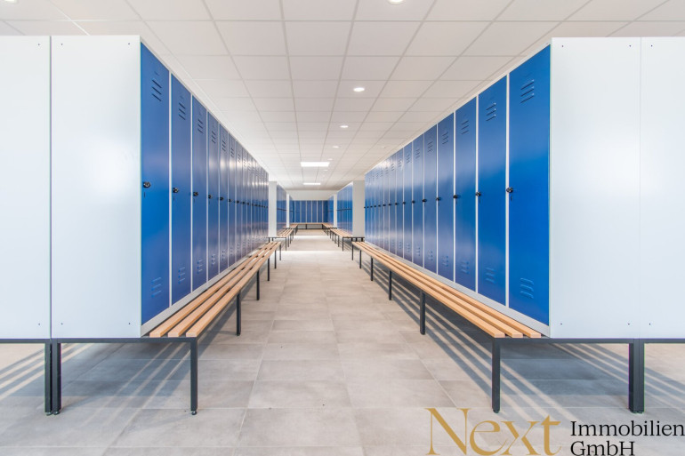 Der zweite Bürotrakt bietet im Erdgeschoss mehrere Büroräume, eine Kantine sowie zusätzliche Technik- und Sanitärbereiche. Sowohl die Büroräumlichkeiten, als auch die Kantine sind bereits vollständig möbliert und können unmittelbar bezogen werden. Im Obergeschoss befinden sich zwei großzügige Umkleideräume mit Spinden sowie zugehörige Duschanlagen mit einer bzw. drei Duschen. Ergänzend stehen in diesem Bereich weitere Sanitäranlagen zur Verfügung. Darüber hinaus befindet sich im Obergeschoss ein modernes Chefbüro mit Besprechungsbereich sowie ein zusätzlicher Abstellraum.