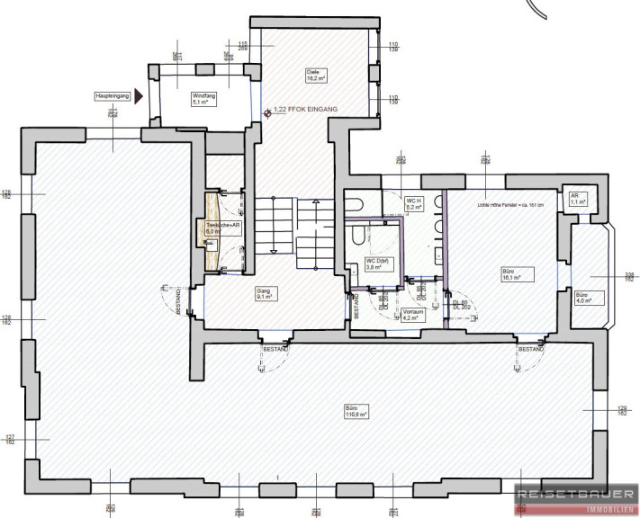 Die Büroeinheit umfasst ein großzügiges Großraumbüro mit rund 111 m², das viel Platz für Arbeitsplätze und flexible Nutzungsmöglichkeiten bietet. Ergänzt wird die Fläche durch ein weiteres Büro mit etwa 16 m², das sich ideal als Besprechungsraum oder ruhiger Arbeitsbereich eignet. Zusätzlich steht ein Abstellraum und ein kleines Zimmer mit ca. 4 m² zur Verfügung, das sich flexibel nutzen lässt. Für den Sanitärbereich stehen getrennte WC-Anlagen zur Verfügung.