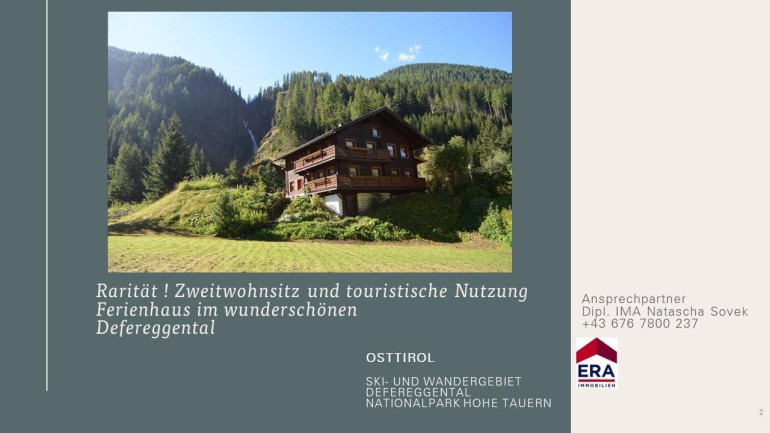 Die Immobilie befindet sich in der Gemeinde St. Jakob im Defereggental. Inmitten des Nationalparks „Hohe Tauern“ gelegen bietet sich Ihnen ein ruhiger, idyllischer Ort zur Erholung vom hektischen Alltag. Das Rauschen des Wasserfalls „Maria Hilf“, welcher hinter dem Ferienhaus fließt und der große Garten laden zum Verweilen und Entspannen ein.