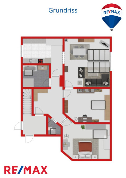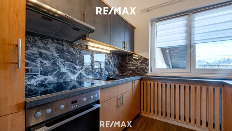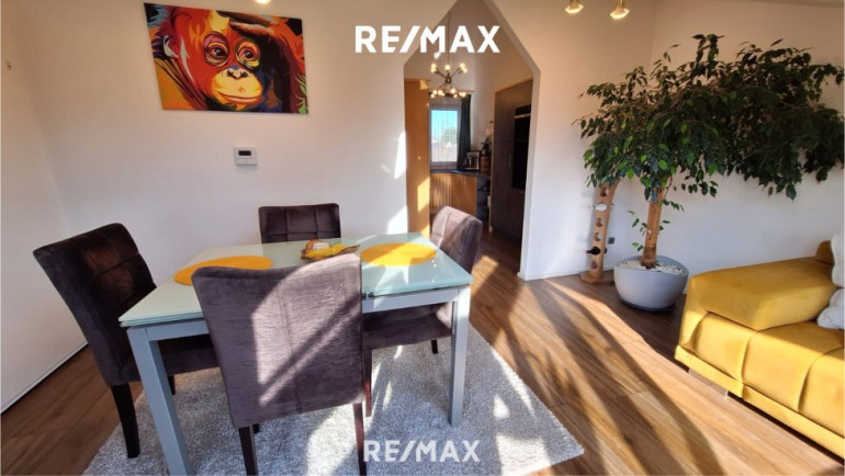 Die neue, modern ausgestattete Einbauküche lädt zum Kochen und Genießen ein. Das angrenzende Wohn- und Esszimmer besticht durch beeindruckende Glasgiebelfenster, die nicht nur für viel Tageslicht sorgen, sondern auch einen herrlichen Weitblick bieten.