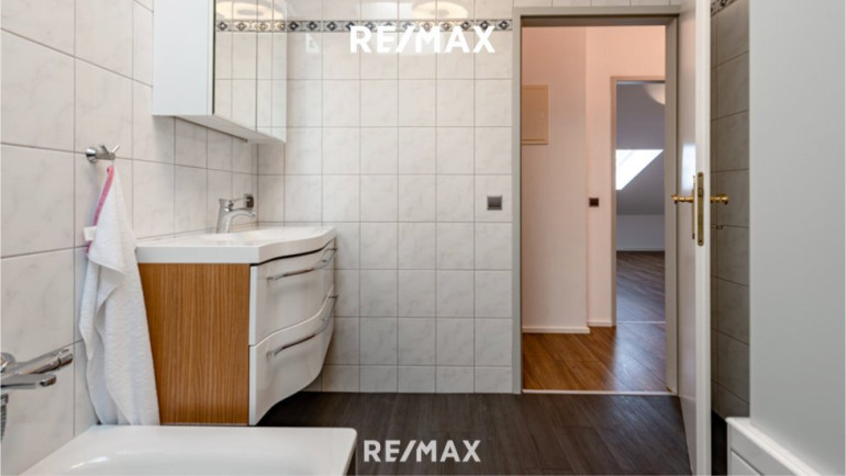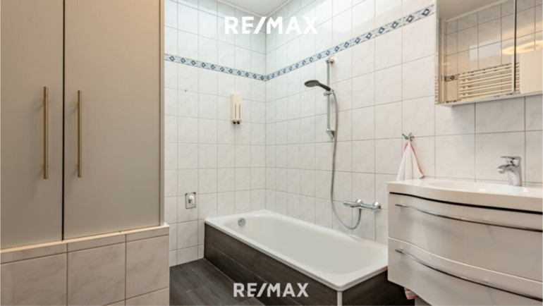 Das großzügige Badezimmer mit Badewanne lädt zum Entspannen ein, ergänzt durch ein separates WC.