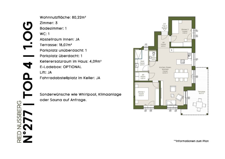 Zur Wohnung zählen zudem, zwei Parkflächen, einer unter dem Carport und einer im Freien, die bereits inkludiert sind.
