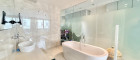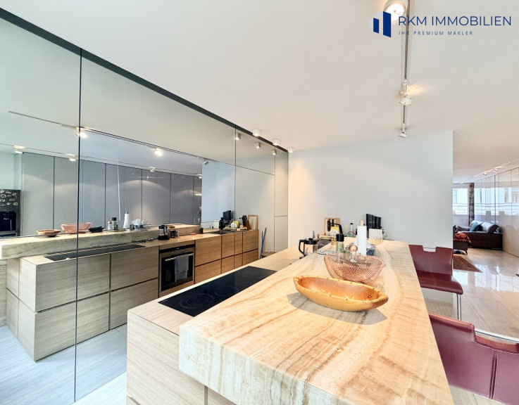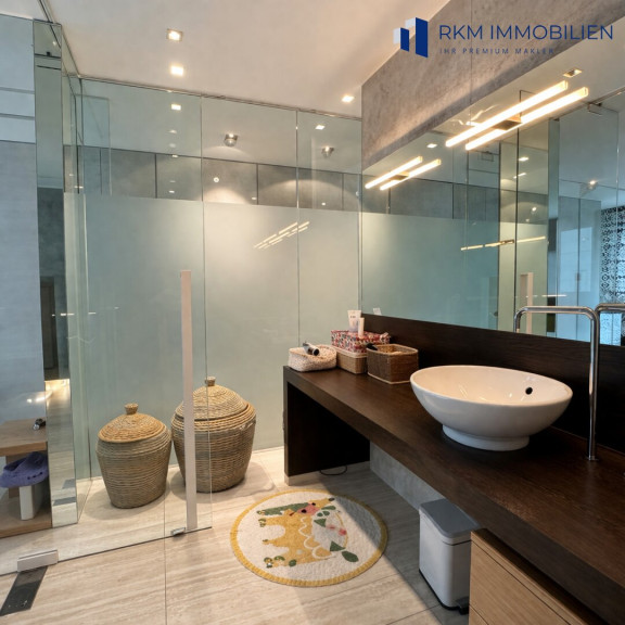 Die hochwertige Design-Küche mit eleganter Kochinsel fügt sich nahtlos in den Wohnraum ein und überzeugt sowohl optisch als auch funktional. Zwei großzügige Schlafzimmer bieten maximale Privatsphäre und verfügen jeweils über ein eigenes, luxuriös ausgestattetes Badezimmer mit Dusche, Badewanne und WC. Edle Materialien, klare Linien sowie stilvolle Glasabtrennungen unterstreichen den modernen Charakter dieser Immobilie.