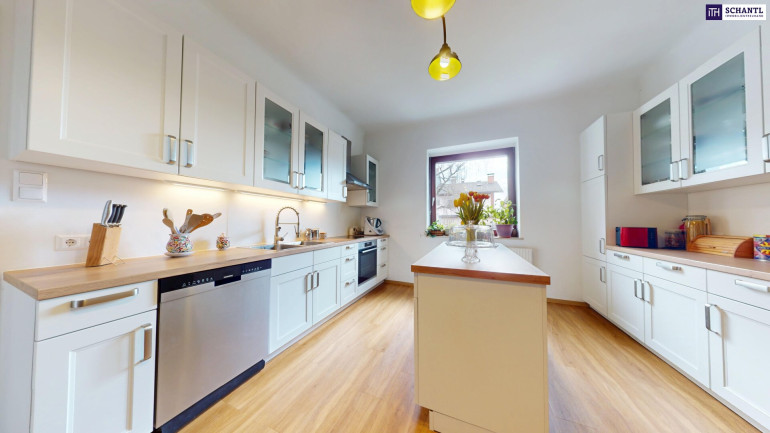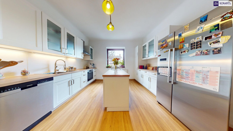 - Große Küche: hier ist eine neue Küche (hochwertige Elektrogeräte) mit Kücheninsel und zusätzlichem Platz für einen großen Familienspeisetisch verbaut – ideal für gemeinsame Mahlzeiten und die täglichen Situationen des Alltags (Schule, Lernen, Hausaufgabe machen etc.)
