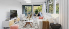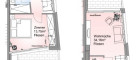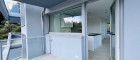 Untere Ebene: Vorraum, Wohnzimmer mit offener Küche und Ausgang auf einen süd- und einen nordseitigen Balkon, Abstellraum, Gäste WC.
