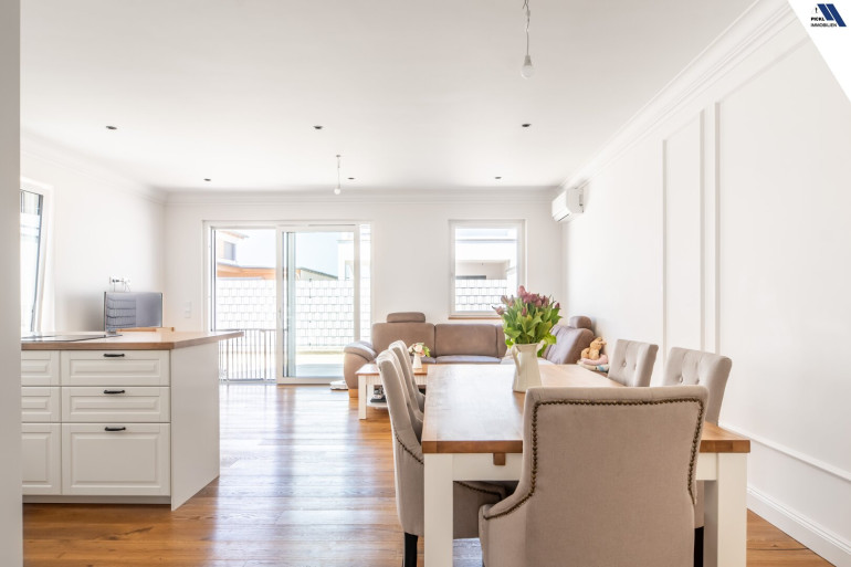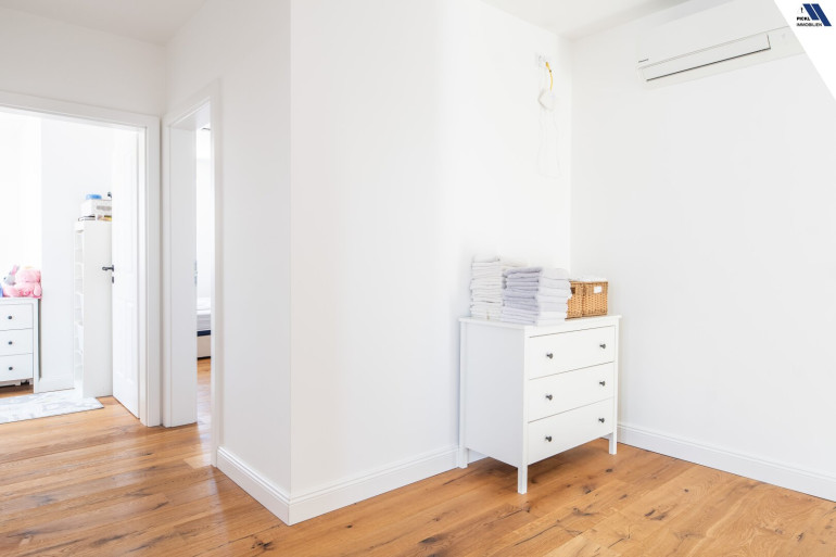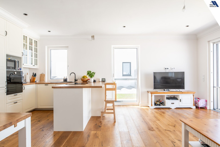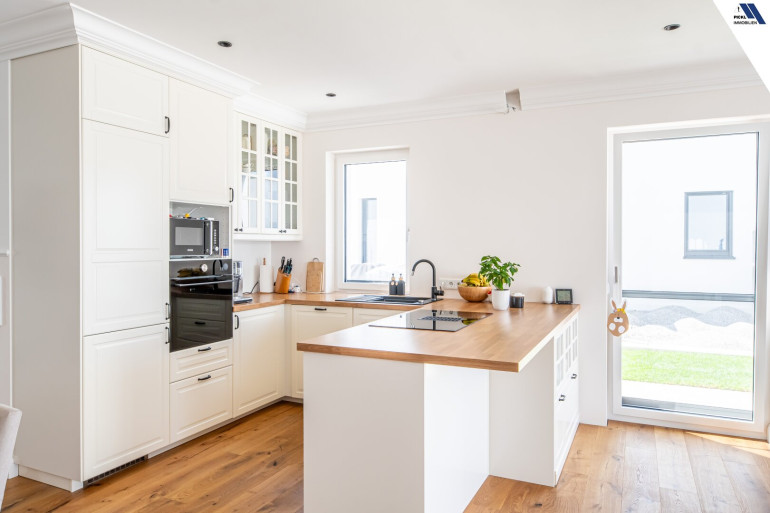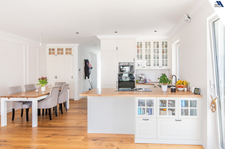 Der beheizte Pool mit automatischer Dosierpumpe sorgt für Erholung und Freizeitvergnügen direkt im eigenen Garten. Zwei helle Bäder, zwei separate WCs, hochwertige Parkettböden sowie eine moderne, funktionale Einbauküche schaffen eine angenehme und einladende Wohnatmosphäre.