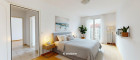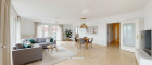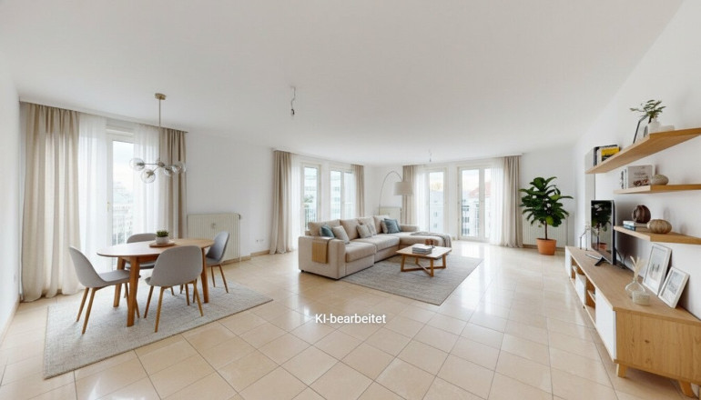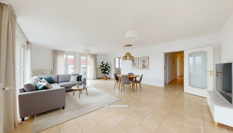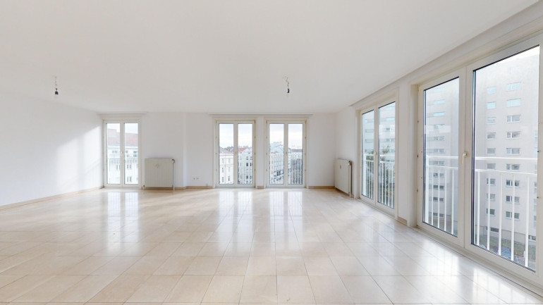 Großzügige, zentral begehbare 4-Zimmerwohnung. Sehr großes 44m² Wohnzimmer plus 3 Schlafzimmer. Separate Küche mit allen elektrischen Geräten, Badezimmer mit Eckbadewanne und Waschmaschinen-Anschluss, separate Toilette und Abstellraum. Praktischer, strapazierfähiger Fliesenboden in allen Räumen außer den Schlafzimmern in denen sich Parkettböden befinden. Angenehme französische Balkone und damit helle Fensterfronten in allen Zimmern.