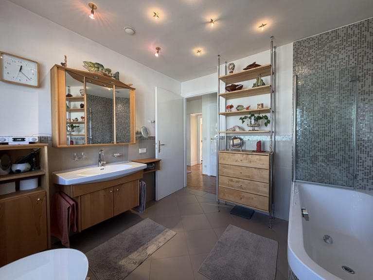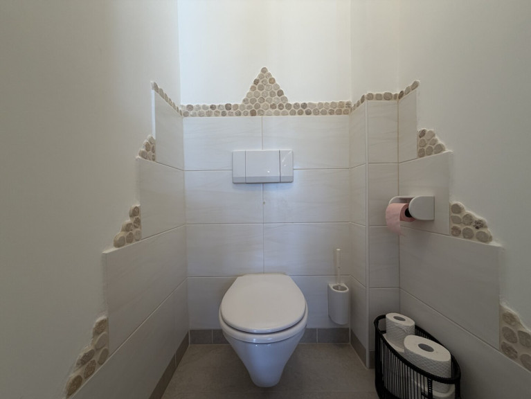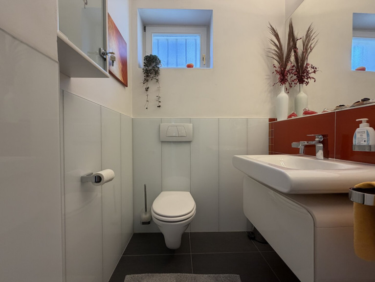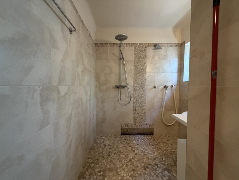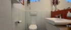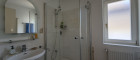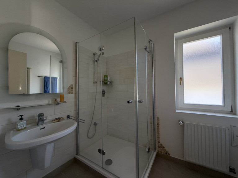 - Geräumige Dusche, Überkopfbrauseset, Kneippschlauch und Handwaschbecken;