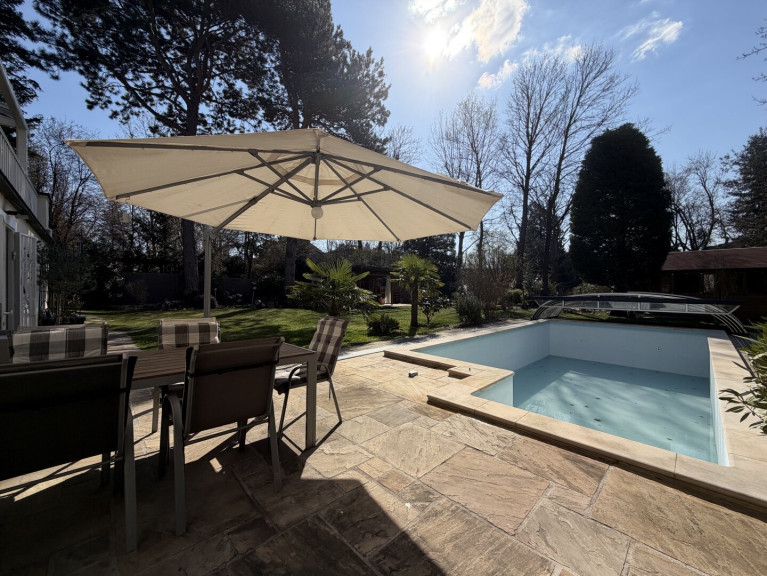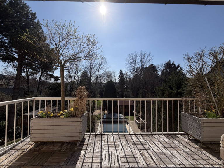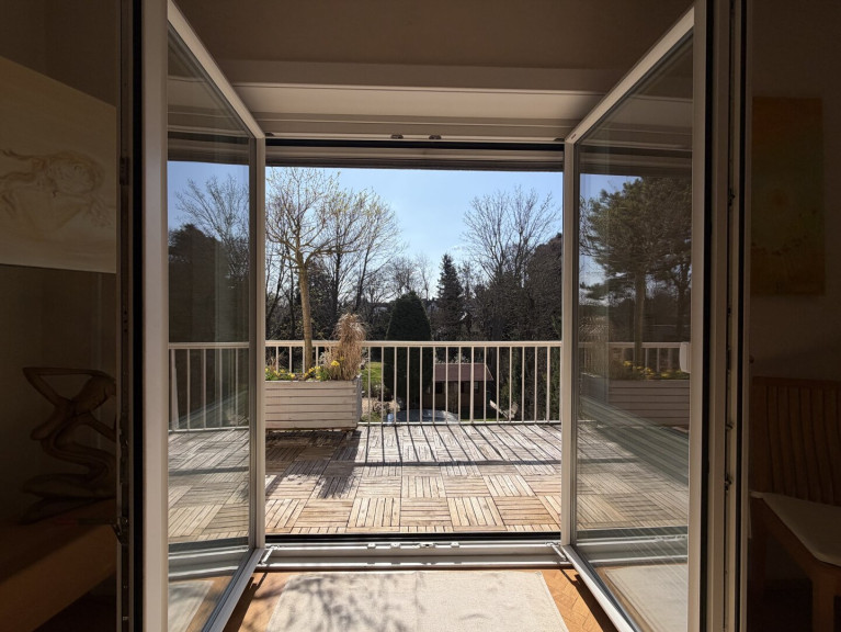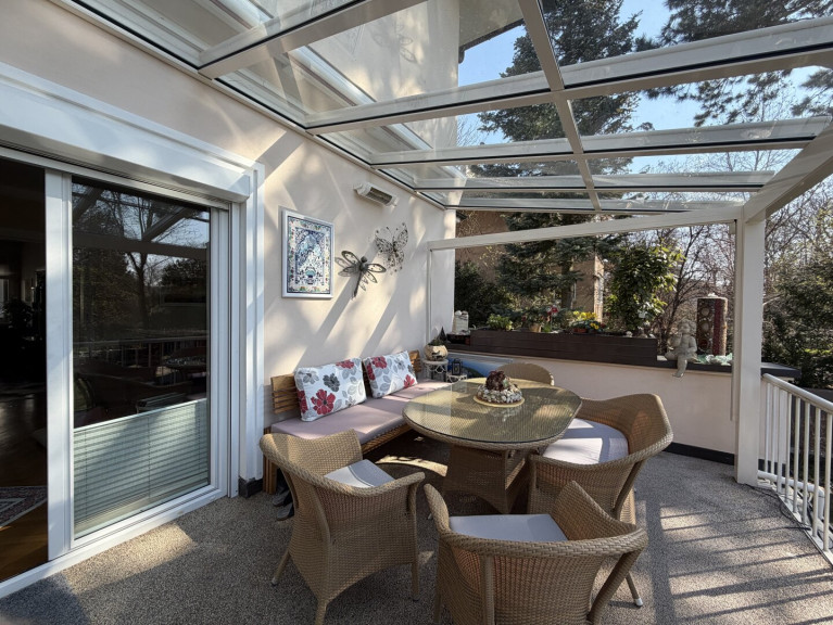 - Fixe (Glas) Überdachung der oberen Terrasse mit elektrischem Sonnenschutz.