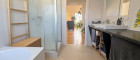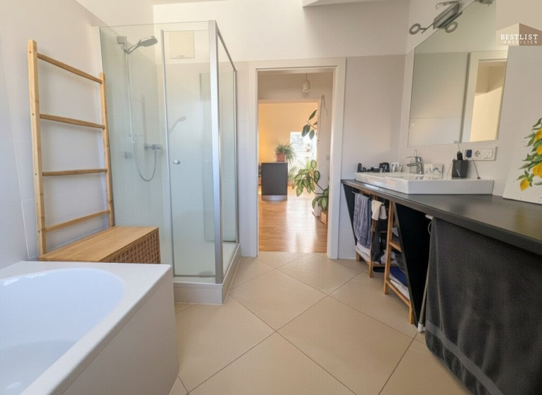 Das Badezimmer vereint Design und Funktionalität auf elegante Weise. Eine großzügige Badewanne lädt zum Entspannen ein, während die separate Dusche modernen Komfort bietet.