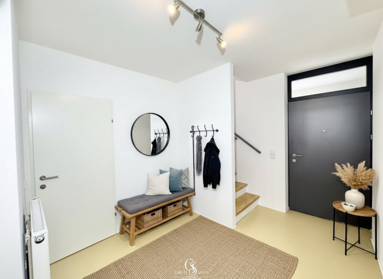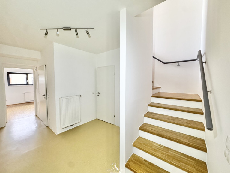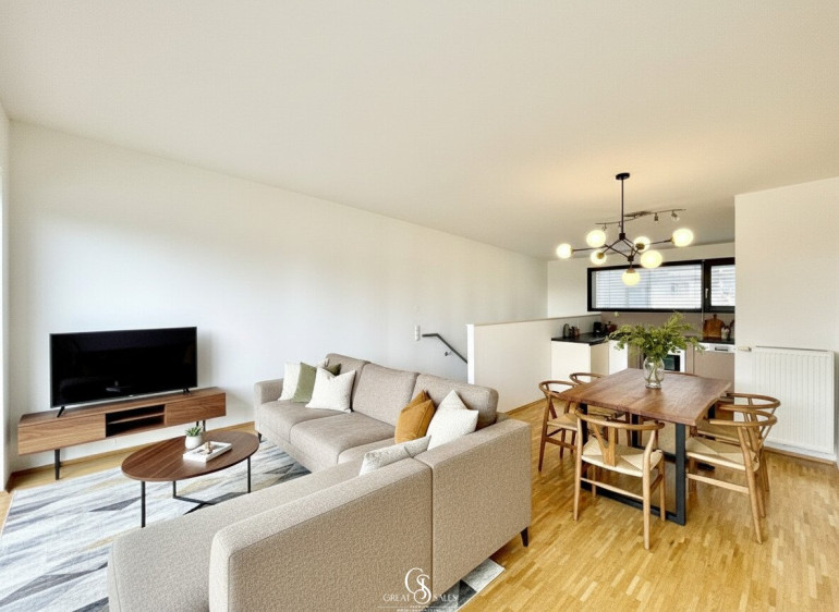 Die Wohnung erstreckt sich über zwei Etagen und überzeugt durch einen gut durchdachten Grundriss sowie helle, offene Räume. Großzügige Fensterflächen sorgen für viel Tageslicht, während die ruhige Terrasse mit Blick in den Innenhof zusätzlichen Wohnkomfort bietet.