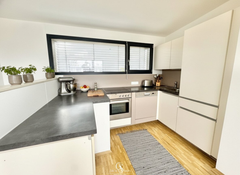 Die offene Wohnküche fügt sich harmonisch in den Wohnbereich ein. Hochwertige Fliesen- und Parkettböden sorgen in der gesamten Wohnung für ein angenehmes Wohnambiente und sind zugleich pflegeleicht. Für ein ganzjährig angenehmes Raumklima sorgt die effiziente Fernwärmeheizung.