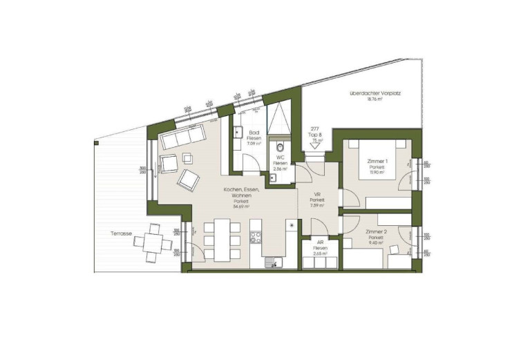 Zur Wohnung zählt zudem ein Carportabstellplatz und ein Parkplatz im Freien.