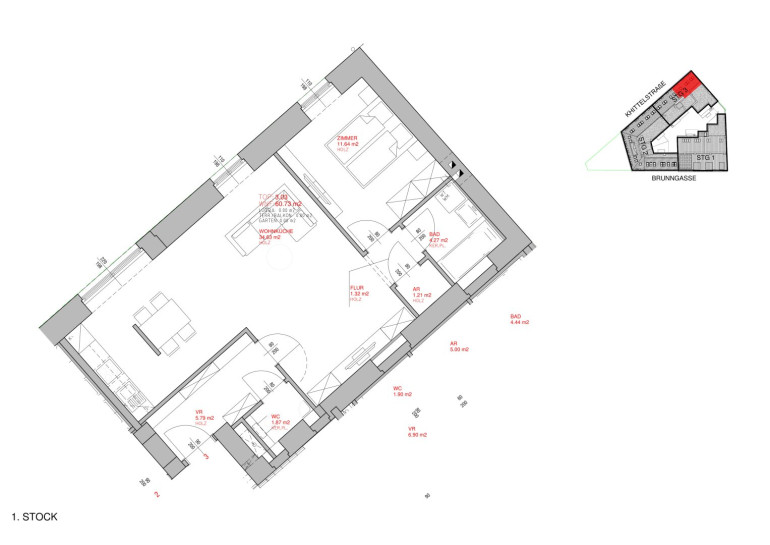 Raumaufteilung: Vorraum, Wohnküche, Schlafzimmer, Innenflur, Bad, WC, Abstellraum
