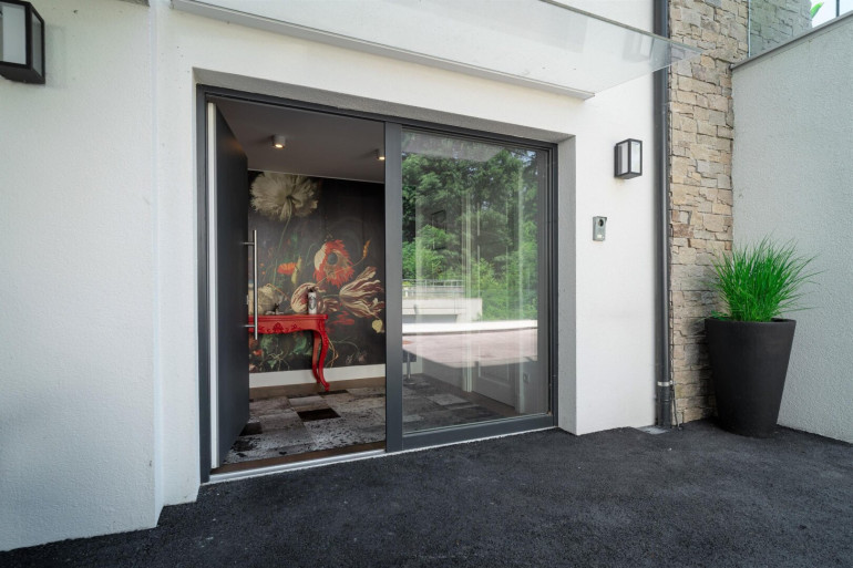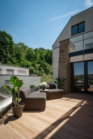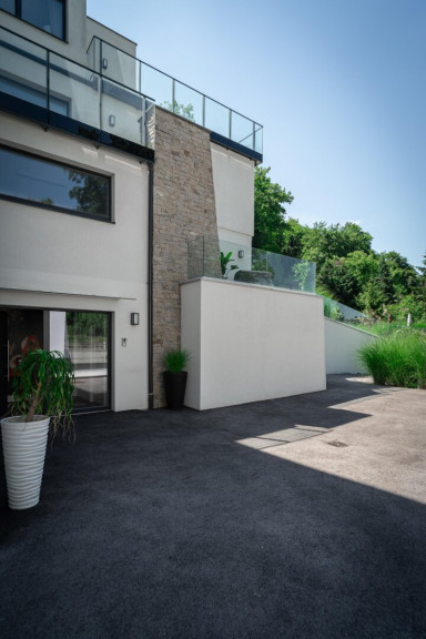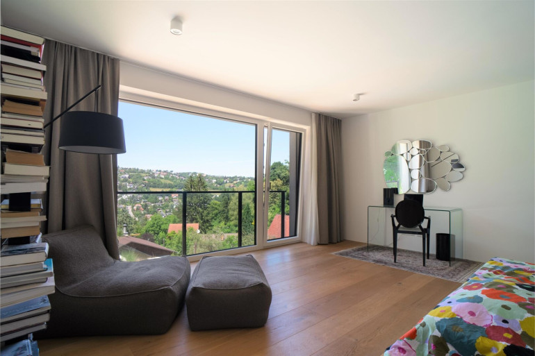 So nah und doch so fern… vom Trubel der Wiener Innenstadt gelegen, befindet sich dieses moderne, in gekuppelter Bauweise errichtete, Anwesen. Hier lebt man einerseits umgeben vom beruhigenden Grün des Waldes, andererseits an die Ruhe einer Sackgasse angrenzend. Die vierstöckige, mit einem Aufzug ausgestattete Villa, sitzt auf einem terrassierten und dadurch ebenen Grundstück, welches sich über zwei Plateaus erstreckt. Von hier aus genießt man einen unvergleichlichen Ausblick auf den Ölberg.