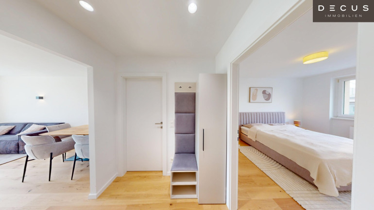 Die Designerküche ist voll ausgestattet – inklusive Induktionsherd und hochwertigen Geräten – und fügt sich harmonisch in den offenen Wohnbereich ein. Wohnzimmer sowie ein Schlafzimmer sind bereits stilvoll möbliert; im Kaufpreis inkludiert sind die Küche und Badmöbel, die übrige Einrichtung ist nicht Bestandteil des Kaufpreises.