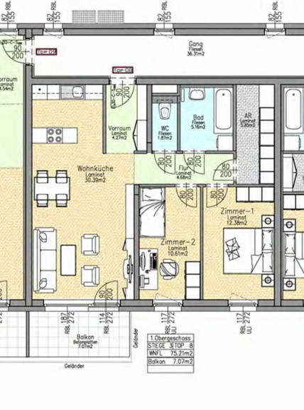 Die Wohnung verfügt über ca. 75 m² Nutzfläche und einen Balkon. Die Wohnräume sind mit Laminatboden, die Nassräume mit Fliesen ausgestattet. 3-fach-verglaste Fenster sorgen für angenehmes Raumklima.
