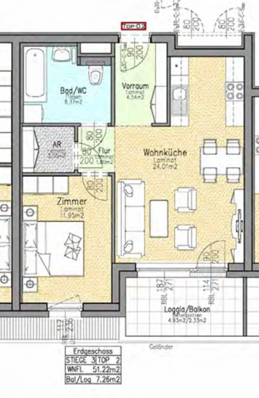 Die Wohnung verfügt über ca. 51 m² Nutzfläche und einen Balkon. Die Wohnräume sind mit Laminatboden, die Nassräume mit Fliesen ausgestattet. 3-fach-verglaste Fenster sorgen für angenehmes Raumklima.