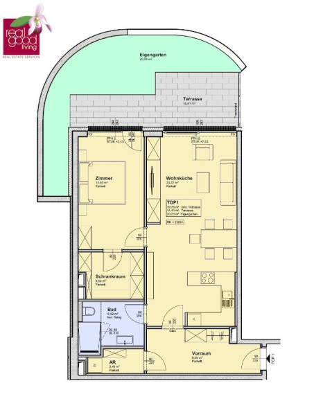 Die Wohnung überzeugt durch eine großzügige Wohnküche, ein ruhiges Schlafzimmer sowie einen separaten Schrankraum und punktet mit einer Terrasse (ca. 14 m²) und Eigengarten (ca. 20 m²) – perfekt zum Entspannen.