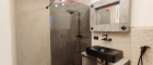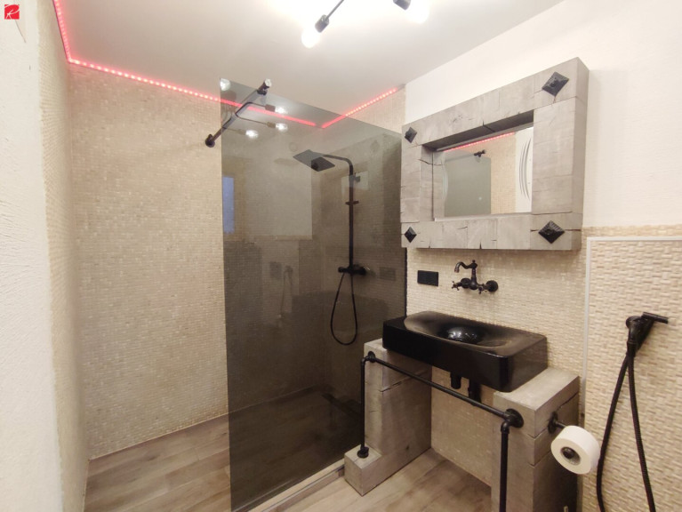 Das moderne Badezimmer ist mit einer Walk-In Dusche, Travertin Stein, Wandheizung und einem WC top ausgestattet.