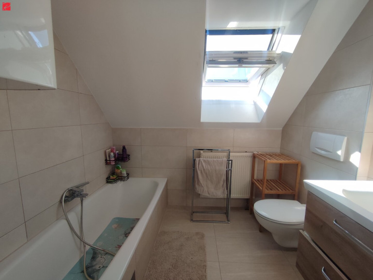 Im oberen Stock befinden sich zwei weitere ruhige Zimmer und ein stilvolles Badezimmer mit Badewanne, diesesund die Toilette wurden 2021 modernisiert.