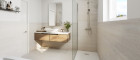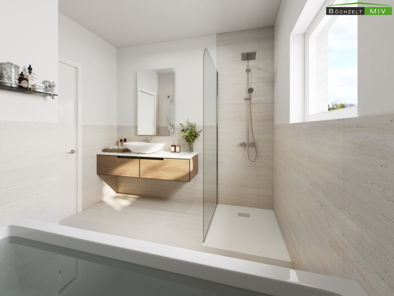 Die Bäder werden mit moderner Sanitärkeramik ausgestattet. Geplant sind eine Acrylbadewanne, eine bodennahe Walk-In-Dusche oder niedrige Duschtasse mit Glastrennwand, ein Waschtisch mit Einhebelmischer sowie ein Handtuchheizkörper. Die WC-Anlagen werden als Hänge-WC mit Unterputzspülkasten ausgeführt. Im Erdgeschoss ist das WC mit einem Handwaschbecken ausgestattet, im Obergeschoss ist ein separates WC ohne Handwaschbecken vorgesehen. Der Waschmaschinenanschluss befindet sich im Technikraum. Im Außenbereich wird je Einheit ein frostsicherer Wasseranschluss im Bereich der Terrasse installiert.