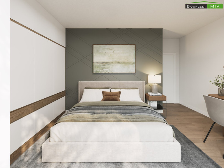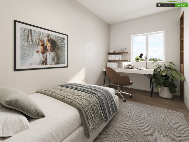 Über die innenliegende Granit-Stiege gelangen Sie in das Obergeschoss. Dort befindet sich ein kompakter Vorraum, von dem alle Zimmer zentral erschlossen werden. Das Elternschlafzimmer bietet mit rund 14 m² ausreichend Platz für ein Doppelbett und einen Kleiderschrank. Zwei weitere Zimmer zwischen etwa 10 m² und 12 m² eignen sich ideal als Kinderzimmer, Gästezimmer oder Homeoffice. Das Badezimmer ist mit Badewanne, Dusche, Waschtisch und Handtuchheizkörper geplant und bietet damit hohen Komfort für den Familienalltag. Ein separates WC im Obergeschoss erhöht die Alltagstauglichkeit zusätzlich, insbesondere für Familien mit Kindern oder bei Besuch. Alle Wohn- und Schlafräume sind klar geschnitten und gut möblierbar. Die funktionale Raumaufteilung sorgt für kurze Wege und eine sinnvolle Trennung von Wohn- und Ruhezonen.