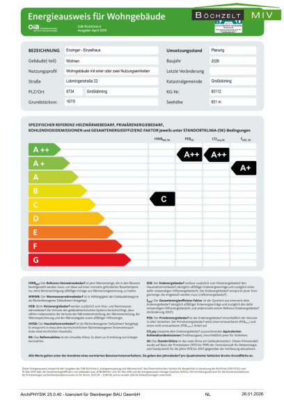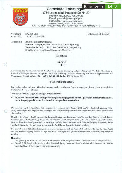 Für das gegenständliche Projekt liegt eine rechtskräftige baubehördliche Bewilligung der Gemeinde Lobmingtal zur Errichtung von zwei Doppelhäusern mit Carports auf dem Grundstück 167/5, KG Großlobming vor. Die Widmung erfolgt als Bauland mit der Ausweisung Dorfgebiet (DO). Die Bebauung und Ausführung haben entsprechend den genehmigten Einreichunterlagen und der Bau- und Ausstattungsbeschreibung zu erfolgen. Die Anschlussgebühren für Kanal, Wasser und Strom sind laut vorliegender Bau- und Ausstattungsbeschreibung im Kaufpreis inkludiert. Die laufenden Betriebskosten wie Strom, Heizung, Wasser, Müll und Gemeindeabgaben fallen verbrauchsabhängig an und sind individuell von den Eigentümern zu tragen. Ein detaillierter Betriebskostenschlüssel liegt naturgemäß erst nach Fertigstellung und Inbetriebnahme vor. Der Kaufpreis je Doppelhaushälfte beträgt 314.900 Euro zuzüglich der üblichen Kaufnebenkosten wie Grunderwerbsteuer, Eintragungsgebühren, Vertragserrichtung und Treuhandabwicklung. Allfällige Sonderwünsche und Ausstattungsänderungen, wie etwa ein Terrassendach, alternative Bodenbeläge wie Vinyl oder Parkett oder zusätzliche Installationen, können je nach Baufortschritt gegen Aufpreis berücksichtigt werden. Der Baustart ist bereits im März 2026 erfolgt.